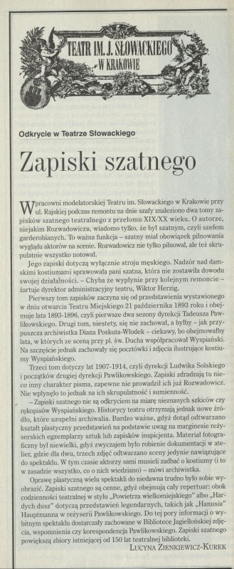 Archiwum / Różności nr 2788 (27/1998) 04/44 Podziel się Tytuł Zapiski szatnego Autor Lucyna Zienkiewicz-Kurek Kategoria Różności Artykuł z numeru 2788 (2789/1998) Data wydania 29 listopada 1998 Tagi teatr im. juliusza słowackiego