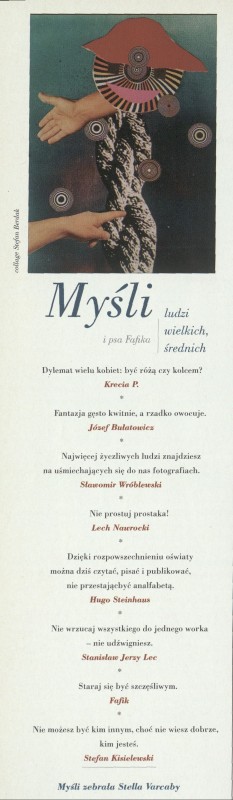 Archiwum / Myśli nr 2842 (28/1999) 123811/123969 Podziel się Tytuł Myśli ludzi wielkich, średnich i psa Fafika Autor Stella Varcaby Rubryka Myśli Artykuł z numeru 2842 (2843/1999) Data wydania 12 grudnia 1999 Tagi myśli Krecia P. Fafik