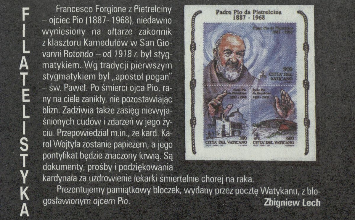Archiwum / Filatelistyka nr 2842 (28/1999) 5528/5531 Podziel się Tytuł Filatelistyka Autor Zbigniew Lech Rubryka Filatelistyka Artykuł z numeru 2842 (2843/1999) Data wydania 12 grudnia 1999 Tagi filatelistyka znaczki pocztowe ojciec Pio