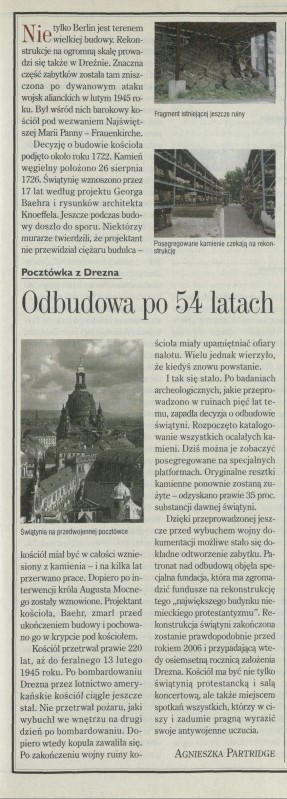 Archiwum / korespondencja własna "Przekroju" nr 2790 (27/1998) 16/113 Podziel się Tytuł Odbudowa po 54 latach Autor Agnieszka Partridge Rubryka korespondencja własna "Przekroju" Artykuł z numeru 2790 (2791/1998) Data wydania 13 grudnia 1998 Tagi Drezno podróże