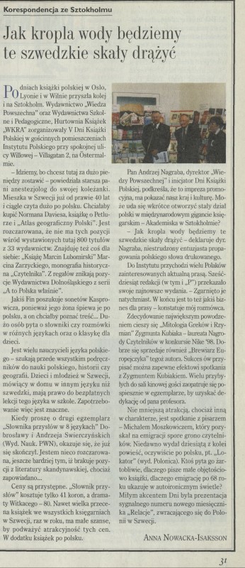 Archiwum / korespondencja własna "Przekroju" nr 2790 (27/1998) 39/42 Podziel się Tytuł Jak kropla wody będziemy te szwedzkie skały drążyć Autor Anna Nowacka-Isaksson Rubryka korespondencja własna "Przekroju" Artykuł z numeru 2790 (2791/1998) Data wydania 13 grudnia 1998 Tagi Szewcja WKRA język