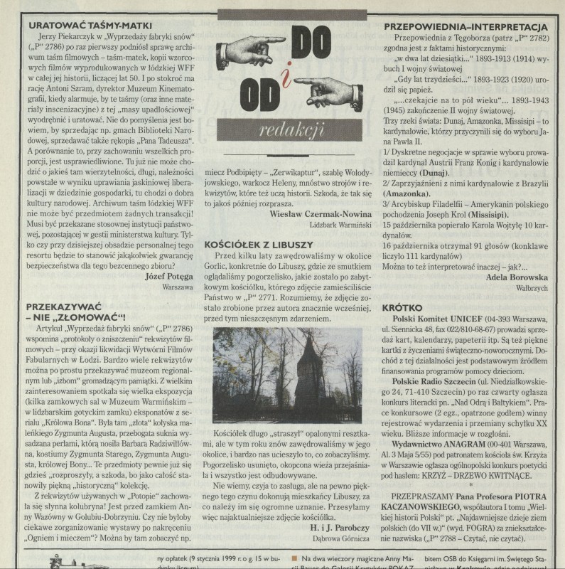 Archiwum / Listy do i od redakcji nr 2790 (27/1998) 120455/123969 Podziel się Tytuł [Listy] Rubryka Listy do i od redakcji Artykuł z numeru 2790 (2791/1998) Data wydania 13 grudnia 1998 Tagi listy do redakcji korespondencja skrzynka odpowiedzi