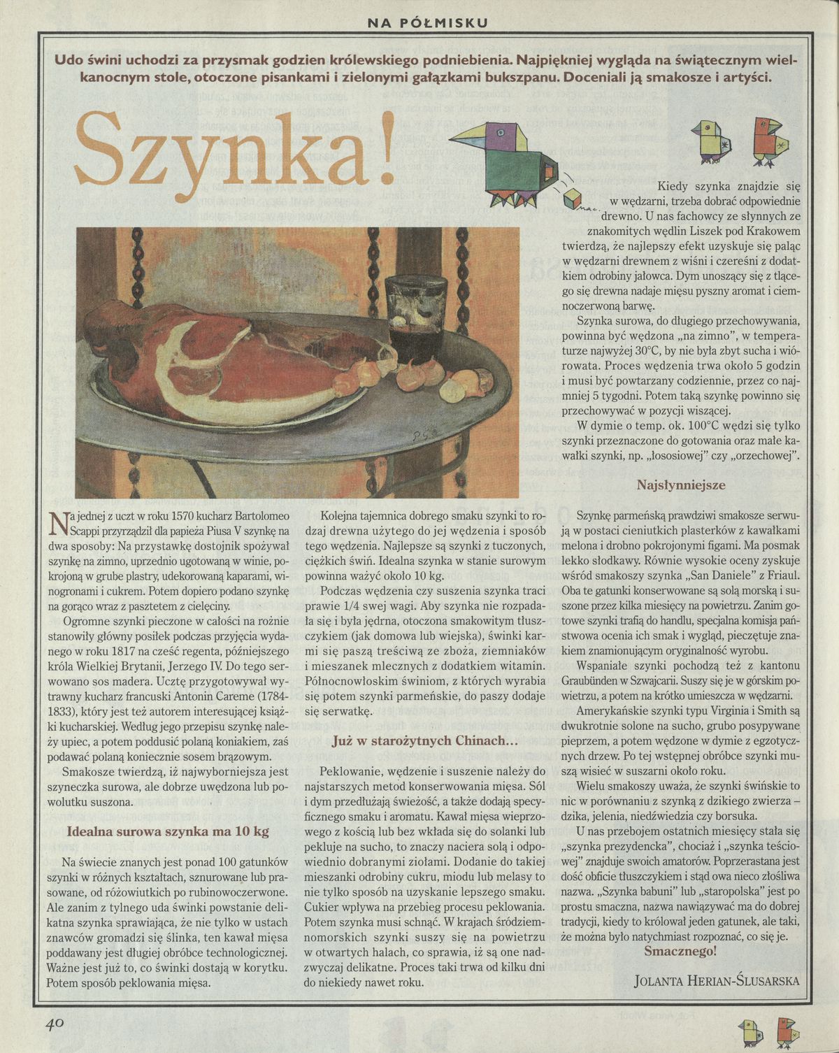 Archiwum / Różności nr 2806 (28/1999) 121501/123969 Podziel się Tytuł Na półmisku: Szynka! Autor Jolanta Herian-Ślusarska Kategoria Różności Artykuł z numeru 2806 (2807/1999) Data wydania 4 kwietnia 1999 Tagi kulinaria kuchnia