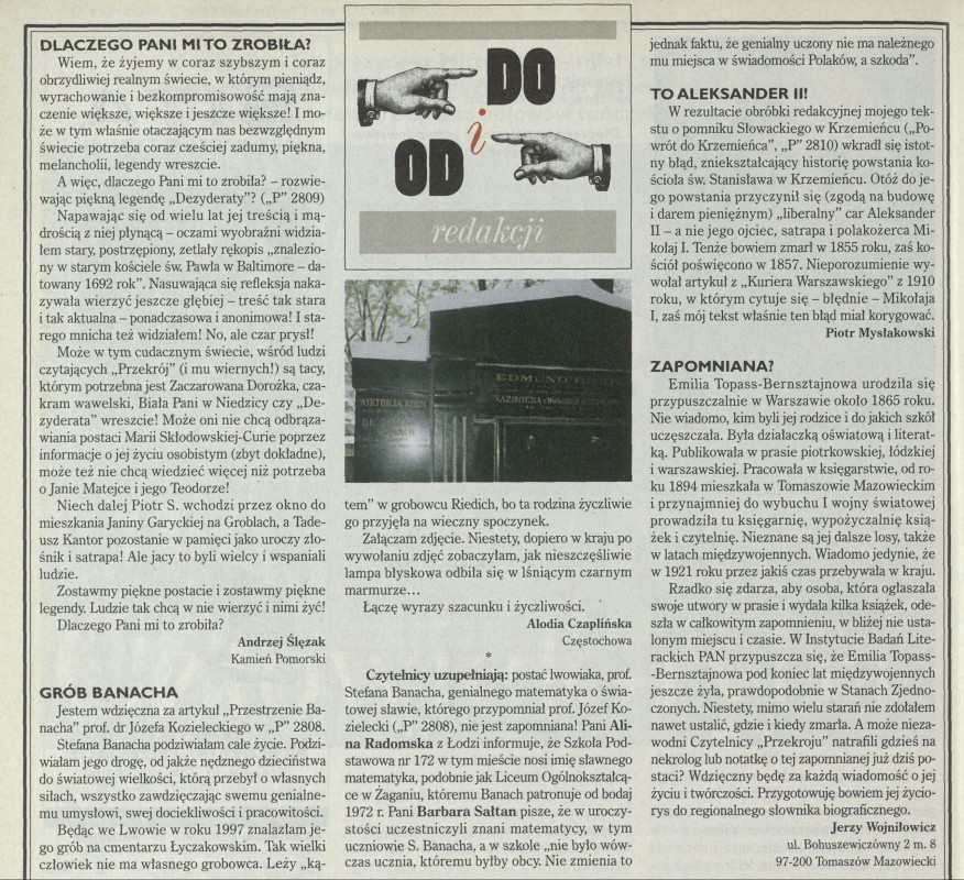Archiwum / Listy do i od redakcji nr 2813 (28/1999) 4/8 Podziel się Tytuł [Listy] Rubryka Listy do i od redakcji Artykuł z numeru 2813 (2814/1999) Data wydania 23 maja 1999 Tagi listy do redakcji korespondencja skrzynka odpowiedzi