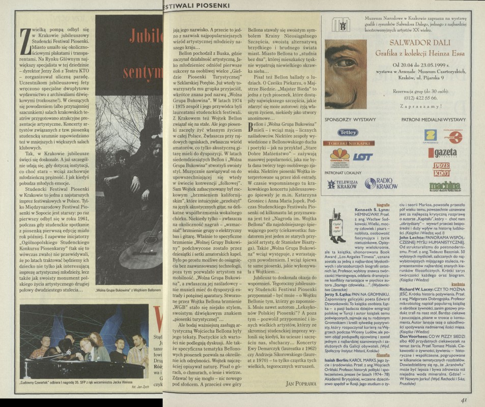 Archiwum / Kultura nr 2813 (28/1999) 121942/123969 Podziel się Tytuł Jubileuszowo i sentymentalnie Autor Jan Poprawa Kategoria Kultura Artykuł z numeru 2813 (2814/1999) Data wydania 23 maja 1999 Tagi Wolna Grupa Bukowina Wojtek Bellon Teatr KTO