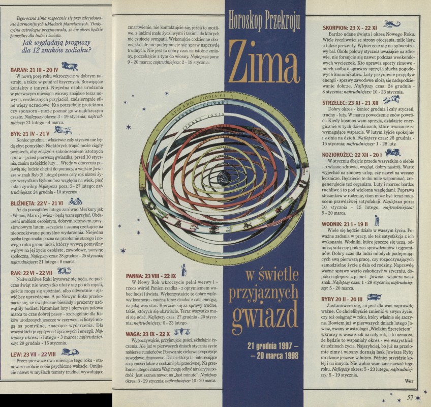 Archiwum / Różności nr 2739-40 (51-52/1997) 119/121 Podziel się Tytuł Horoskop Przekroju - Zima w świetle przyjaznych gwiazd Autor wer Kategoria Różności Artykuł z numeru 2739-40 (51/1997) Data wydania 21 grudnia 1997