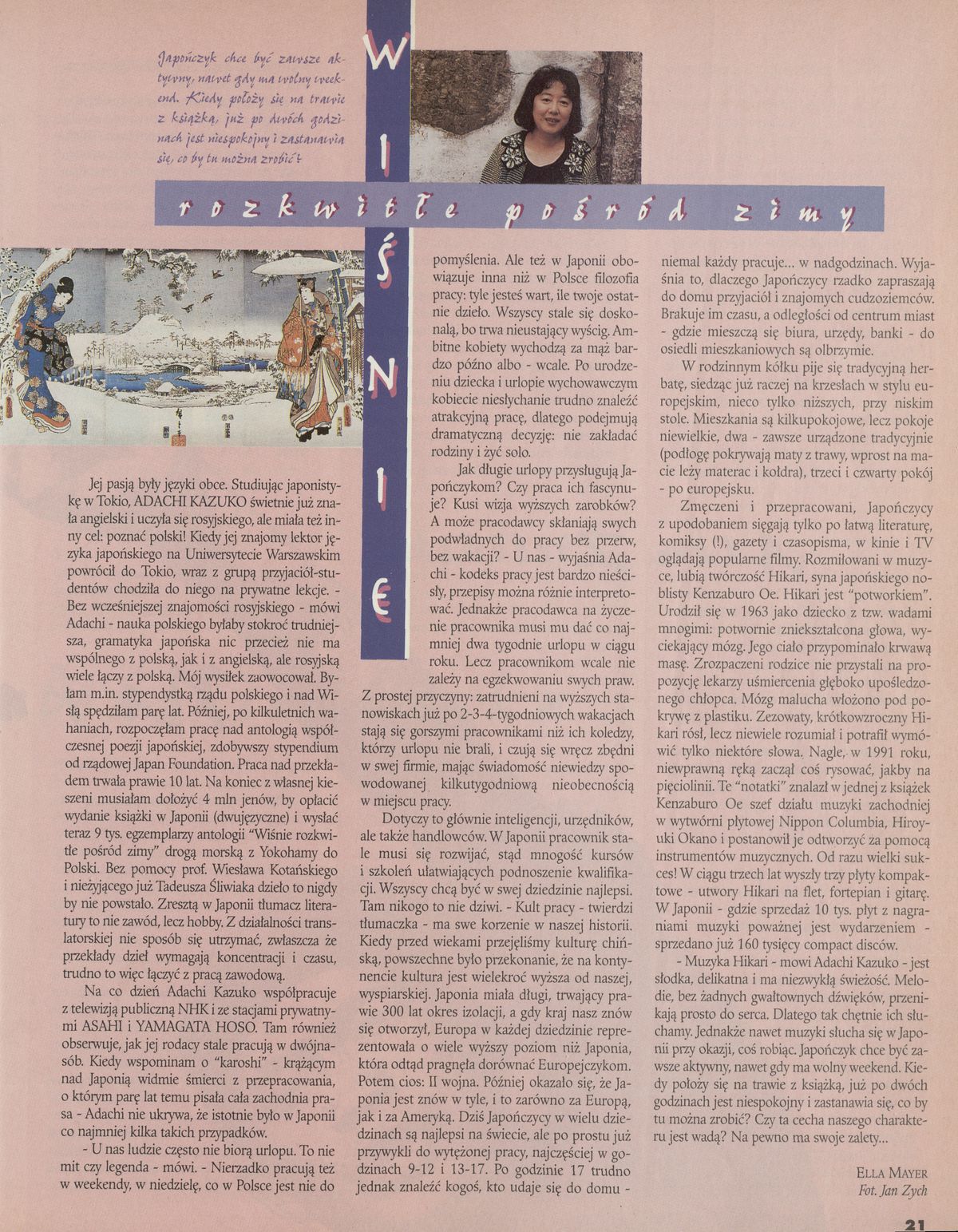 Archiwum / Reportaż nr 2613 (30/1995) 610/7031 Podziel się Tytuł Wiśnie rozkwitłe pośród zimy Autor Ella Mayer Kategoria Reportaż Artykuł z numeru 2613 (30/1995) Data wydania 23 lipca 1995 Tagi Japonia Adachi Kazuko