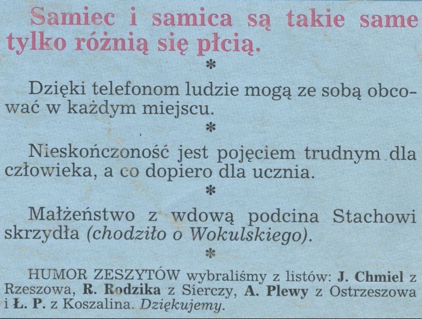 Archiwum / Humor zeszytów szkolnych nr 2613 (30/1995) 26/47 Podziel się Tytuł Humor zeszytów Rubryka Humor zeszytów szkolnych Artykuł z numeru 2613 (30/1995) Data wydania 23 lipca 1995 Tagi powiedzonka