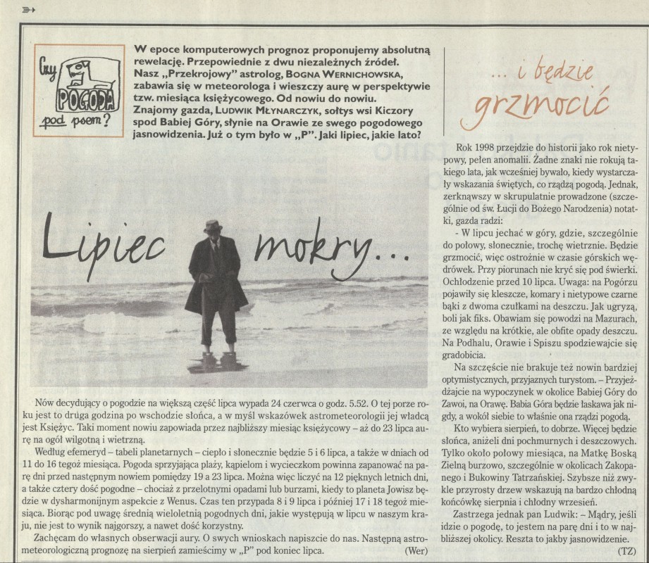 Archiwum / Czy pogoda pod psem? nr 2767 (27/1998) 42/51 Podziel się Tytuł Lipiec mokry Rubryka Czy pogoda pod psem? Artykuł z numeru 2767 (2768/1998) Data wydania 5 lipca 1998