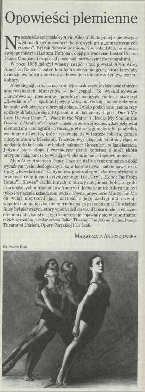 Archiwum / Recenzja nr 2833 (28/1999) 51/171 Podziel się Tytuł Opowieści plemienne Autor Małgorzata Andrzejewska-Psarska Kategoria Recenzja Artykuł z numeru 2833 (2834/1999) Data wydania 10 października 1999 Tagi balet taniec Ailey gospel równouprawnienie