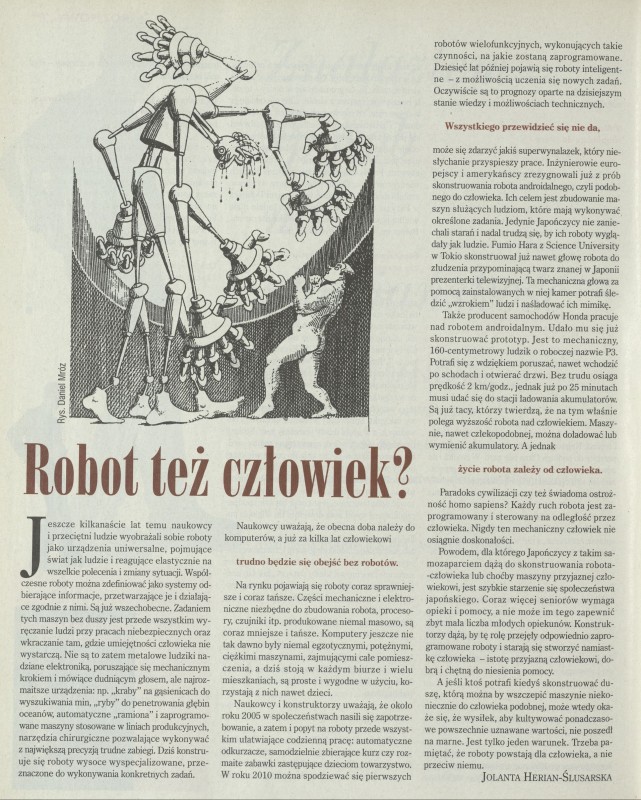 Archiwum / Artykuł nr 2833 (28/1999) 123166/123969 Podziel się Tytuł Robot też człowiek ? Autor Jolanta Herian-Ślusarska Kategoria Artykuł Artykuł z numeru 2833 (2834/1999) Data wydania 10 października 1999 Tagi cywilizacja