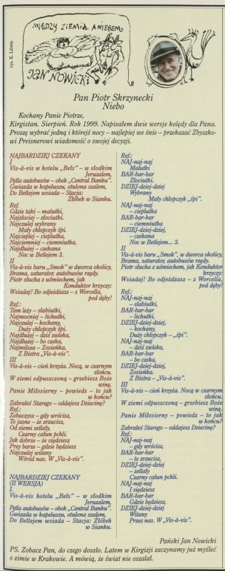 Archiwum / Felieton nr 2827 (28/1999) 29/88 Podziel się Tytuł Między ziemią a niebem: Pan Piotr Skrzynecki. Niebo Autor Jan Nowicki Kategoria Felieton Artykuł z numeru 2827 (2828/1999) Data wydania 29 sierpnia 1999 Tagi Zbigniew Preisner