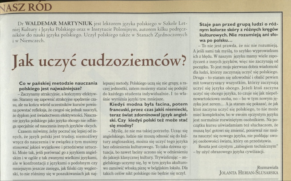 Archiwum / Wywiad nr 2827 (28/1999) 122771/123969 Podziel się Tytuł Jak uczyć cudzoziemców? Autor Jolanta Herian-Ślusarska Kategoria Wywiad Artykuł z numeru 2827 (2828/1999) Data wydania 29 sierpnia 1999 Tagi Waldemar Maryniuk