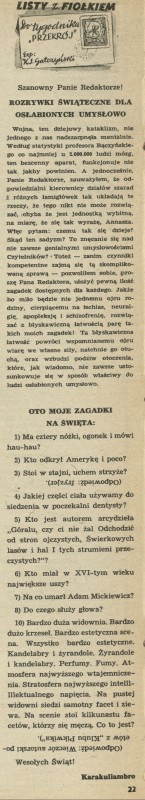 Archiwum / Listy z fiołkiem nr 141-42 (51-52/1947) 01/49 Podziel się Tytuł Rozrywki swiateczne dla oslabionych umyslowo Autor Konstatny Ildefons (Karakuliambro) Gałczyński Rubryka Listy z fiołkiem Artykuł z numeru 141-42 (51/1947) Data wydania 21 grudnia 1947