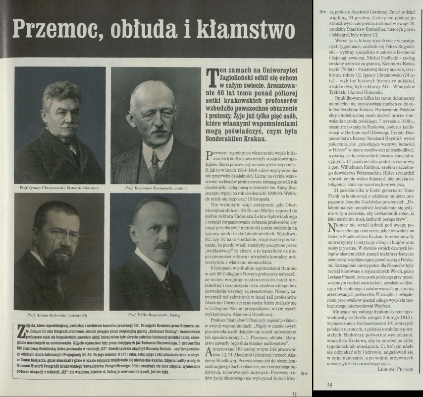 Archiwum / Społeczeństwo nr 2837 (28/1999) 05/36 Podziel się Tytuł Przemoc, obłuda i kłamstwo Autor Lesław Peters Kategoria Społeczeństwo Artykuł z numeru 2837 (2838/1999) Data wydania 7 listopada 1999 Tagi Uniwersytet Jagielloński Sonderaktion Krakau