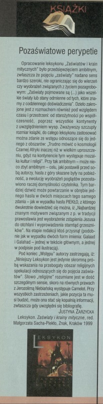 Archiwum / Książki nr 2837 (28/1999) 947/954 Podziel się Tytuł Książki. Pozaświatowe perypetie Autor Justyna Zarzycka Rubryka Książki Artykuł z numeru 2837 (2838/1999) Data wydania 7 listopada 1999 Tagi Leksykon. Zaświaty i krainy mityczne