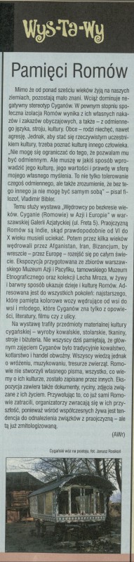 Archiwum / Kultura nr 2837 (28/1999) 123503/123969 Podziel się Tytuł Wys-Ta-Wy: Pamięci Romów Autor Agnieszka Wrzesień Kategoria Kultura Artykuł z numeru 2837 (2838/1999) Data wydania 7 listopada 1999 Tagi Galeria Azjatycka