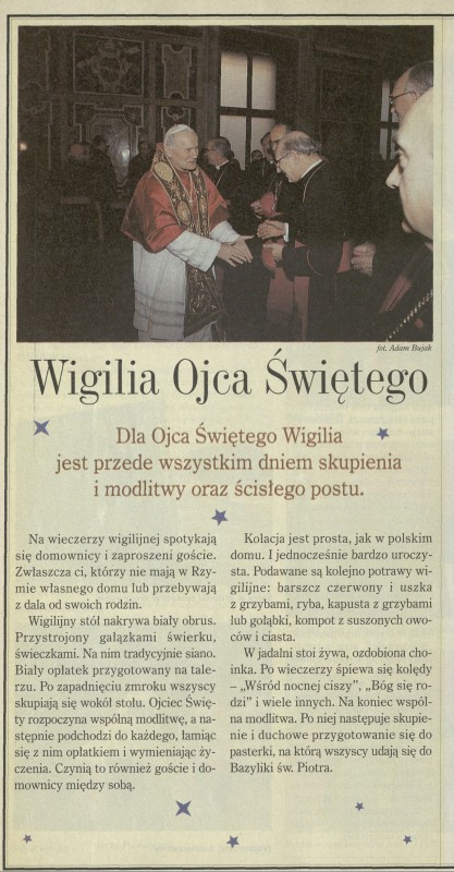 Archiwum / Relacja nr 2791-92 (27-27/1998) 3372/121061 Podziel się Tytuł Wigilia Ojca Świętego Kategoria Relacja Artykuł z numeru 2791-92 (2792/1998) Data wydania 20 grudnia 1998 Tagi papież Jan Paweł II