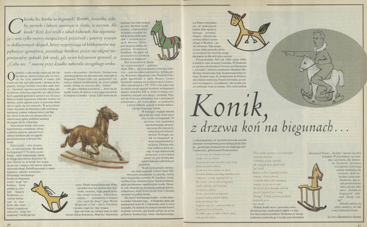 Archiwum / Kultura nr 2791-92 (27-27/1998) 120594/123969 Podziel się Tytuł Konik, z drzewa koń na biegunach... Autor Lucyna Zienkiewicz-Kurek Kategoria Kultura Artykuł z numeru 2791-92 (2792/1998) Data wydania 20 grudnia 1998 Tagi Krzysztof Tyniec