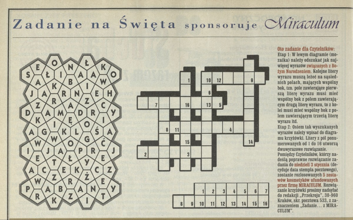Archiwum / Krzyżówka nr 2791-92 (27-27/1998) 715/799 Podziel się Tytuł Zadanie na Święta sponsoruje Miraculum Rubryka Krzyżówka Artykuł z numeru 2791-92 (2792/1998) Data wydania 20 grudnia 1998 Tagi Miraculum