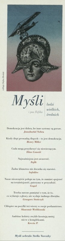 Archiwum / Myśli nr 2840 (28/1999) 03/550 Podziel się Tytuł Myśli ludzi wielkich, średnich i psa Fafika Autor Stella Varcaby Rubryka Myśli Artykuł z numeru 2840 (2841/1999) Data wydania 28 listopada 1999