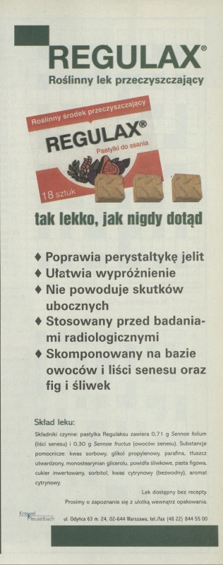Archiwum / Reklamy nr 2840 (28/1999) 101/103 Podziel się Tytuł [Reklama: Regulax] Rubryka Reklamy Artykuł z numeru 2840 (2841/1999) Data wydania 28 listopada 1999