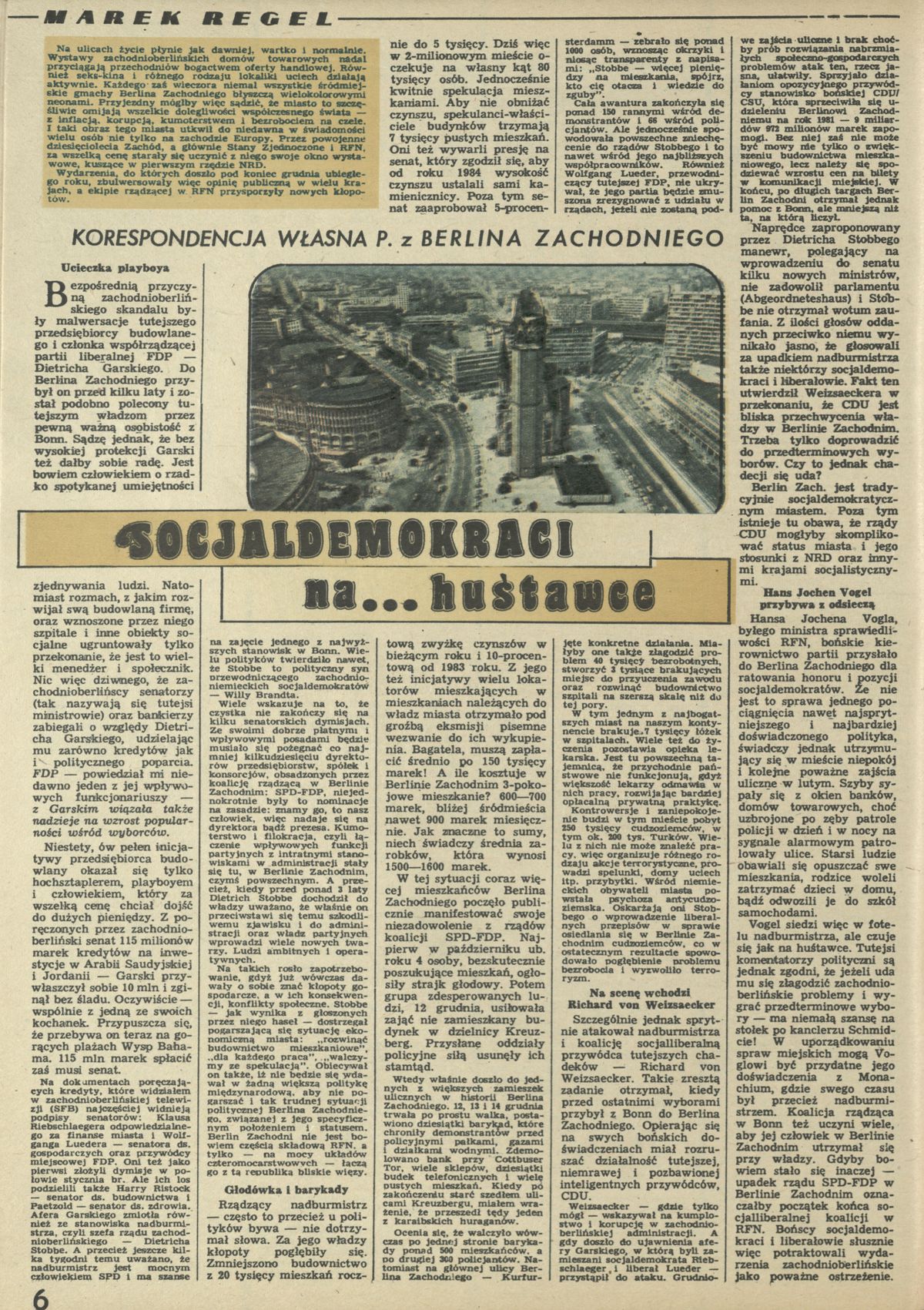 Archiwum / korespondencja własna "Przekroju" nr 1872 (08/1981) 02/21 Podziel się Tytuł Korespondencja z Berlina Zachodniego Autor Marek Regel Rubryka korespondencja własna "Przekroju" Artykuł z numeru 1872 (8/1981) Data wydania 22 lutego 1981 Tagi berlin