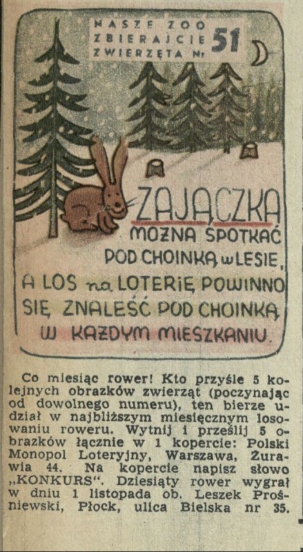 Archiwum / Konkurs nr specjalny 50/1953 16507/123969 Podziel się Tytuł Nasze ZOO - zbierajcie zwierzęta Rubryka Konkurs Artykuł z numeru nr specjalny 50/1953 Data wydania 13 grudnia 1953 Tagi zajączek loteria