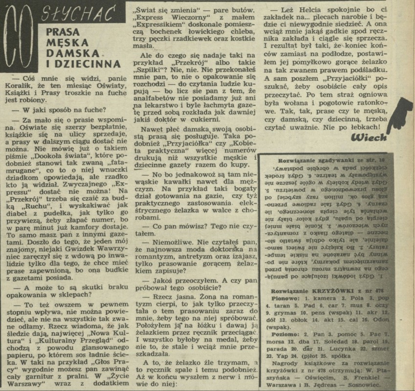 Archiwum / Felieton nr 480 (25/1954) 38/79 Podziel się Tytuł Co słychać. Prasa męska, damska i dziecinna Autor Wiech Kategoria Felieton Artykuł z numeru 480 (25/1954) Data wydania 20 czerwca 1954 Tagi "Express" "Ruch"
