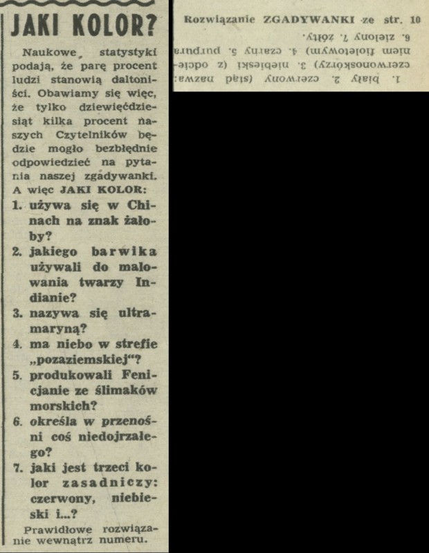 Archiwum / Zastanów się nr 479 (24/1954) 112/269 Podziel się Tytuł Jaki kolor? Rubryka Zastanów się Artykuł z numeru 479 (24/1954) Data wydania 13 czerwca 1954 Tagi zagadka zgadywanka