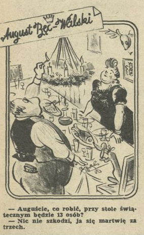 Archiwum / August Bęc-Walski nr 141-42 (51-52/1947) 34/1638 Podziel się Tytuł – Auguście, co robić, przy stole świątecznym będzie 13 osób Autor Karol "Charlie" Ferster Rubryka August Bęc-Walski Artykuł z numeru 141-42 (51/1947) Data wydania 21 grudnia 1947 Tagi żart rysunkowy satyra święta wigilia