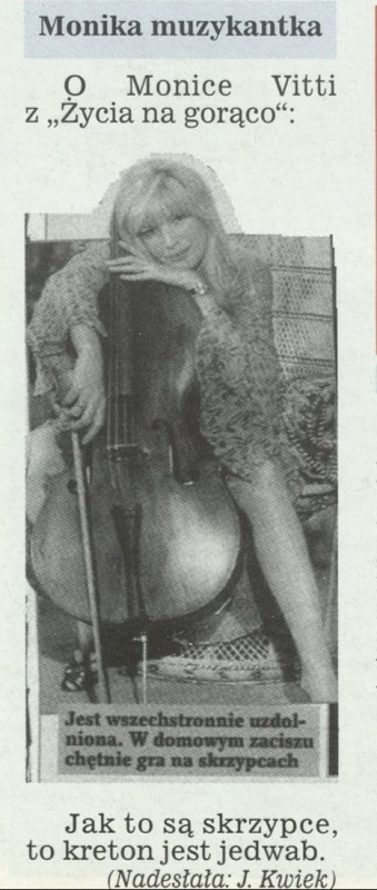 Archiwum / Rozmaitości [old] nr 2770 (27/1998) 33/65 Podziel się Tytuł Monika muzykantka Rubryka Rozmaitości [old] Artykuł z numeru 2770 (2771/1998) Data wydania 26 lipca 1998 Tagi Monica Vitti skrzypce wiolonczela