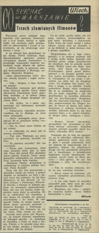 Archiwum / Felieton nr 475 (20/1954) 15/28 Podziel się Tytuł Co słychać w Warszawie? Trzech słomianych flimonów Autor Wiech Kategoria Felieton Artykuł z numeru 475 (20/1954) Data wydania 16 maja 1954
