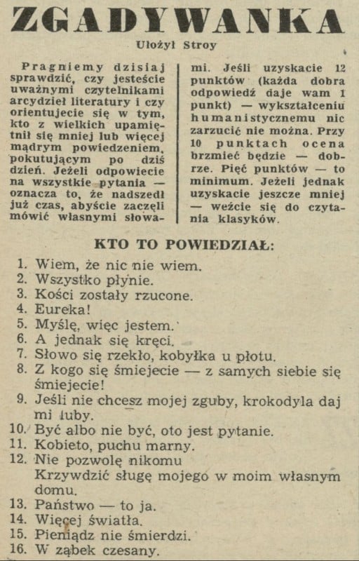 Archiwum / Zgadywanki Przekroju nr 254 (08/1950) 14/646 Podziel się Tytuł Kto to powiedział? Autor Stroy Rubryka Zgadywanki Przekroju Artykuł z numeru 254 (8/1950) Data wydania 19 lutego 1950 Tagi zagadka zgadywanka łamigłówka