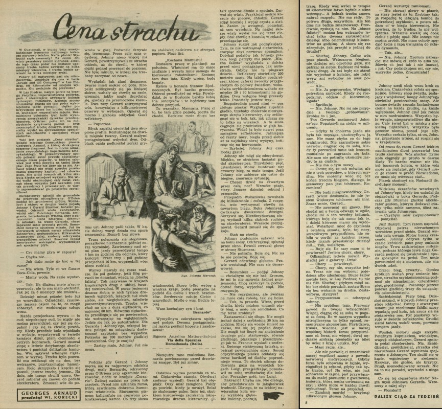 Archiwum / Opowiadanie nr 337 (39/1951) 45/59 Podziel się Tytuł Cena strachu Autor Georges Arnaud Władysław Korecki Kategoria Opowiadanie Artykuł z numeru 337 (39/1951) Data wydania 23 września 1951 Tagi Guatemala