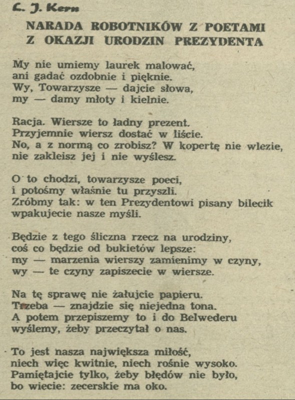 Archiwum / Przekrój tygodnia nr 368 (17/1952) 27/88 Podziel się Tytuł Narada robotników z poetami z okazji urodzin Prezydenta Autor Ludwik Jerzy Kern Rubryka Przekrój tygodnia Artykuł z numeru 368 (17/1952) Data wydania 27 kwietnia 1952 Tagi Bierut