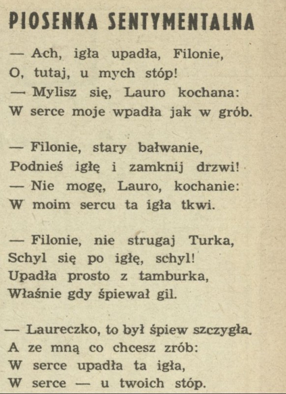Archiwum / Poezja nr 370 (19/1952) 227/324 Podziel się Tytuł Piosenka sentymentalna Autor Konstanty Ildefons Gałczyński Kategoria Poezja Artykuł z numeru 370 (19/1952) Data wydania 11 maja 1952