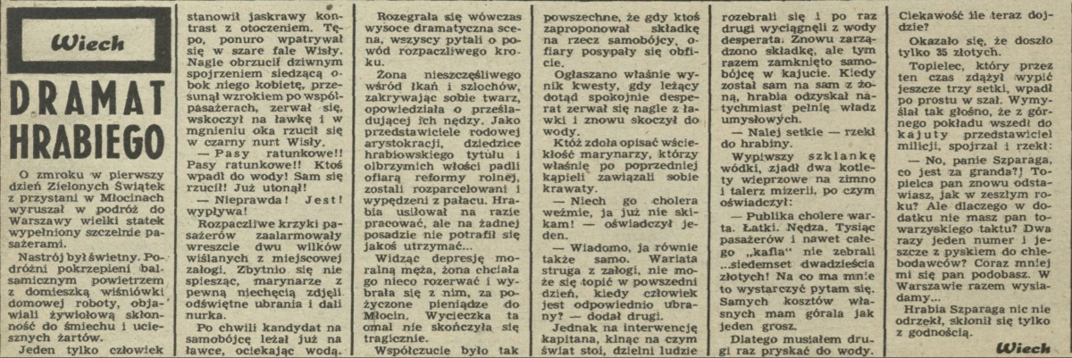 Archiwum / Felieton nr 165 (23/1948) 4923/123969 Podziel się Tytuł Dramat hrabiego Autor Wiech Kategoria Felieton Artykuł z numeru 165 (23/1948) Data wydania 6 czerwca 1948 Tagi Wiech
