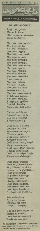 Archiwum / Pigułki - organ Janusza Minkiewicza nr 165 (23/1948) 23/36 Podziel się Tytuł Bilans osobisty Autor Janusz Minkiewicz Rubryka Pigułki - organ Janusza Minkiewicza Artykuł z numeru 165 (23/1948) Data wydania 6 czerwca 1948 Tagi satyra wiersz życie