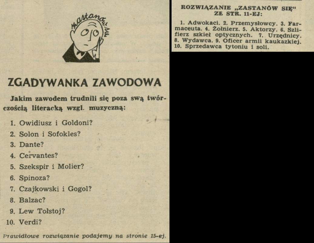 Archiwum / Zastanów się nr 337 (39/1951) 13/269 Podziel się Tytuł Zgadywanka zawodowa Rubryka Zastanów się Artykuł z numeru 337 (39/1951) Data wydania 23 września 1951 Tagi twórczość zagadka