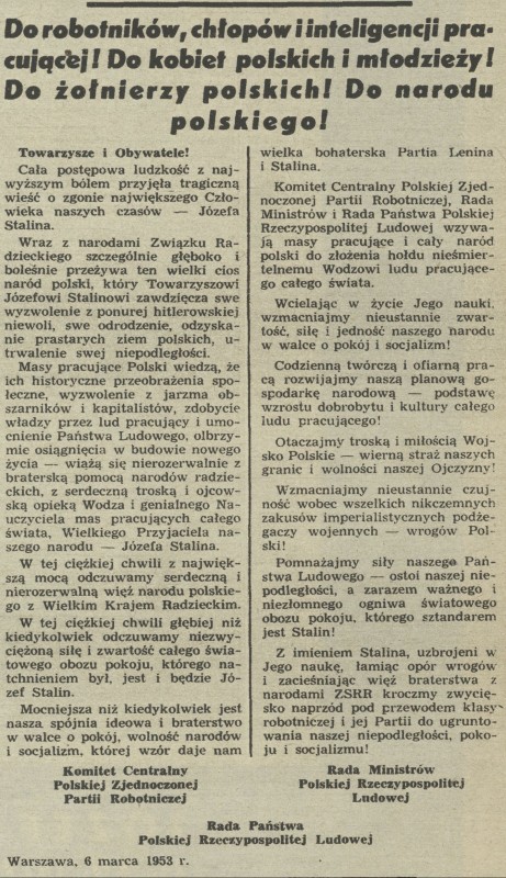 Archiwum / Esej nr 414 (11/1953) 07/18 Podziel się Tytuł Do robotników, chłopów i inteligencji pracującej! Do kobiet polskich i młodzieży! Do żołnierzy polskich! Do narodu polskiego! Kategoria Esej Artykuł z numeru 414 (11/1953) Data wydania 10 marca 1953 Tagi Stalin żałoba