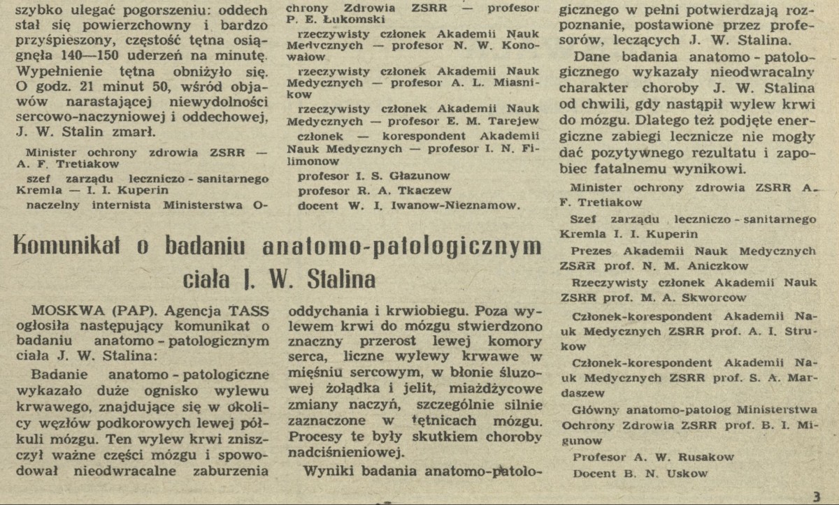 Archiwum / Artykuł nr 414 (11/1953) 13/58 Podziel się Tytuł Komunikat o badaniu anatomo-patologicznym ciała J. Stalina Kategoria Artykuł Artykuł z numeru 414 (11/1953) Data wydania 10 marca 1953 Tagi żałoba