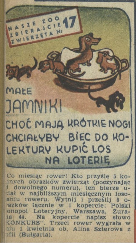 Archiwum / Konkurs nr 419 (16/1953) 14894/123969 Podziel się Tytuł Nasze ZOO - zbierajcie zwierzęta Rubryka Konkurs Artykuł z numeru 419 (16/1953) Data wydania 13 kwietnia 1953 Tagi jamnik