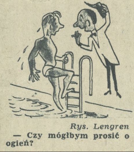 Archiwum / Rozmaitości [old] nr 425 (22/1953) 33/49 Podziel się Tytuł Ogień Autor Zbigniew Lengren Rubryka Rozmaitości [old] Artykuł z numeru 425 (22/1953) Data wydania 21 maja 1953 Tagi żart rysunkowy basen pływak palacz