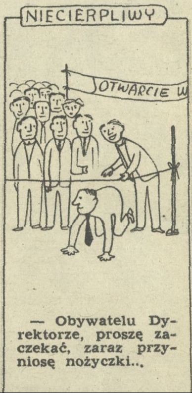 Archiwum / Historyjki obrazkowe nr 430 (27/1953) 105/164 Podziel się Tytuł Niecierpliwy Autor Marian Eile Kategoria Historyjki obrazkowe Artykuł z numeru 430 (27/1953) Data wydania 5 lipca 1953 Tagi żart rysunkowy nożyczki otwarcie