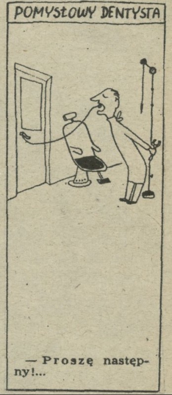 Archiwum / Historyjki obrazkowe nr 437 (34/1953) 13363/123969 Podziel się Tytuł Pomysłowy dentysta Autor Marian Eile Kategoria Historyjki obrazkowe Artykuł z numeru 437 (34/1953) Data wydania 23 sierpnia 1952 Tagi żart rysunkowy stomatolog ząb
