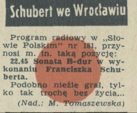 Archiwum / Rozmaitości [old] nr 437 (34/1953) 102/2346 Podziel się Tytuł Schubert we Wrocławiu Rubryka Rozmaitości [old] Artykuł z numeru 437 (34/1953) Data wydania 23 sierpnia 1952