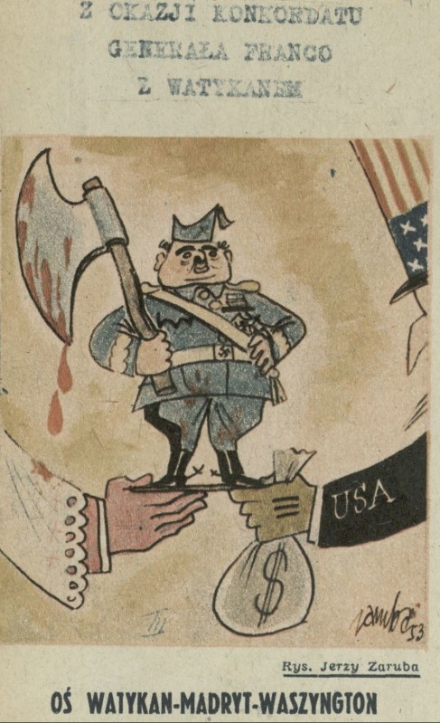 Archiwum / Rozmaitości [old] nr 440 (37/1953) 2/3 Podziel się Tytuł Oś Watykan-Madryt-Waszyngton Autor Jerzy Zaruba Rubryka Rozmaitości [old] Artykuł z numeru 440 (37/1953) Data wydania 13 września 1953 Tagi propaganda karykatura satyra episkopat kościół USA Franco