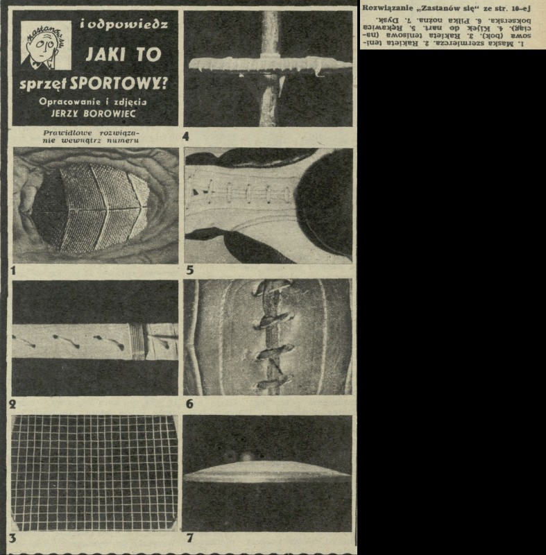 Archiwum / Zastanów się nr 452 (49/1953) 31/794 Podziel się Tytuł Jaki to sprzęt sportowy? Autor Jerzy Borowiec Rubryka Zastanów się Artykuł z numeru 452 (49/1953) Data wydania 6 grudnia 1953
