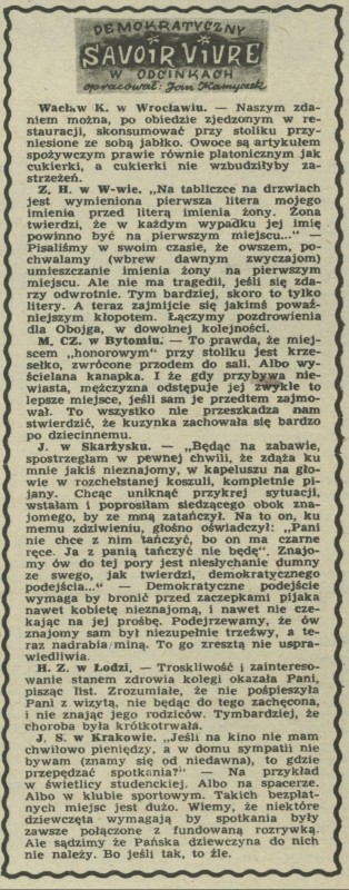 Archiwum / Demokratyczny savoir-vivre nr 467 (12/1954) 17143/123969 Podziel się Tytuł Demokratyczny savoir-vivre Autor Jan Kamyczek Rubryka Demokratyczny savoir-vivre Artykuł z numeru 467 (12/1954) Data wydania 21 marca 1954 Tagi obyczaje kultura